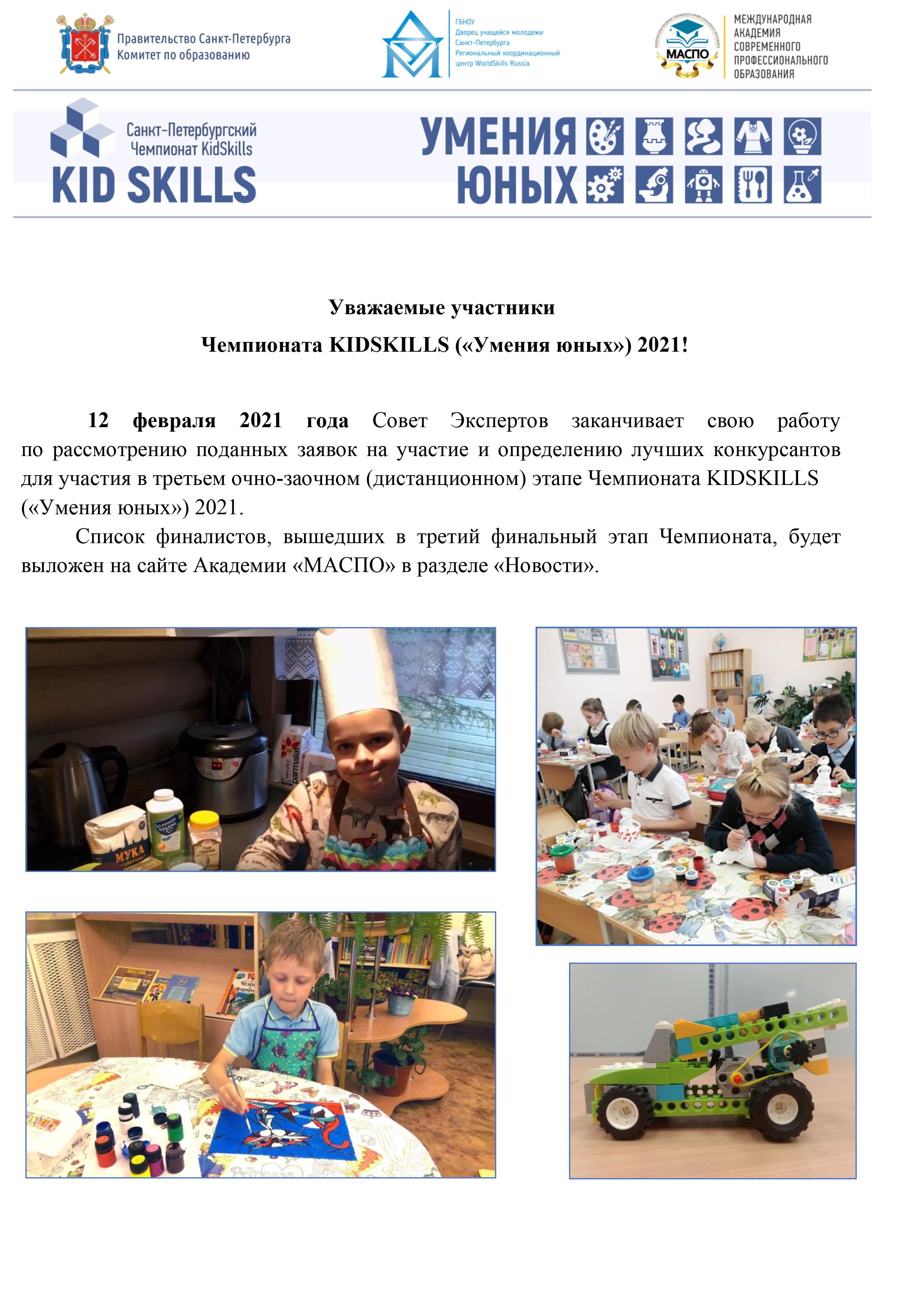 12 февраля 2021 состоится подведение итогов второго отборочного этапа Чемпионата KIDSKILLS ("Умения юных") 2021