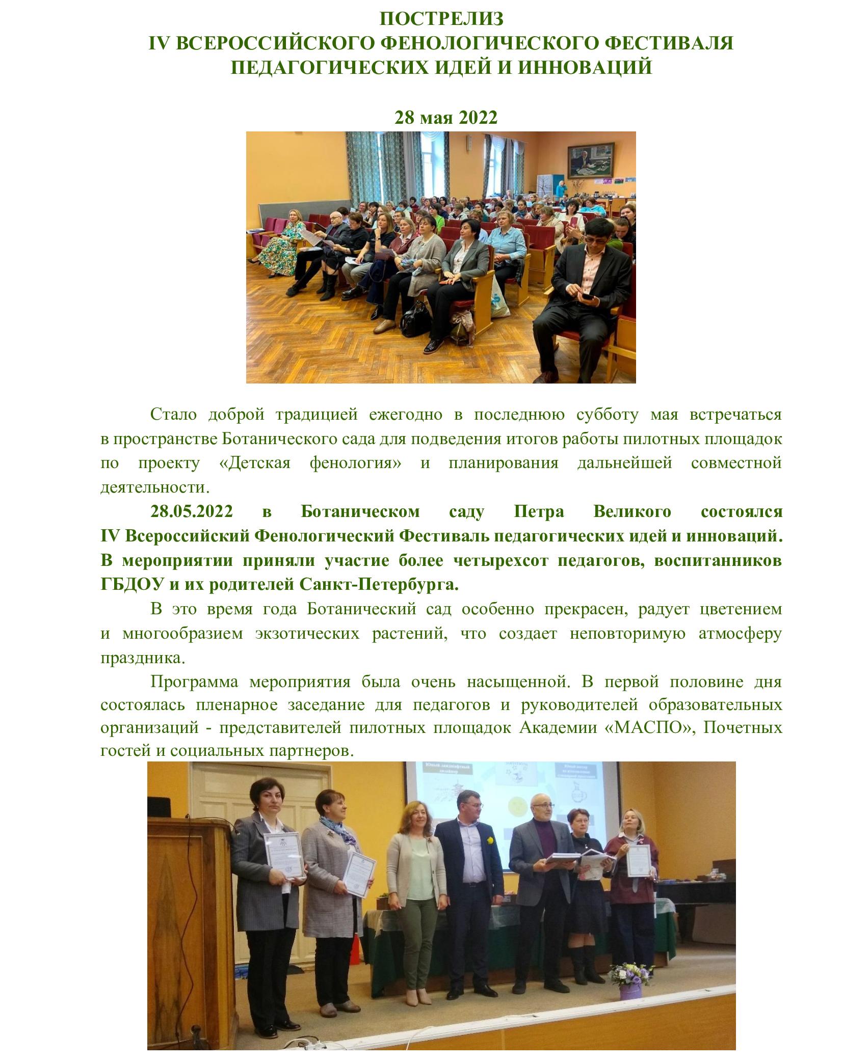 28 мая 2022 ПОСТ-РЕЛИЗ IV ВСЕРОССИЙСКОГО ФЕНОЛОГИЧЕСКОГО ФЕСТИВАЛЯ ПЕДАГОГИЧЕСКИХ ИДЕЙ И ИННОВАЦИЙ