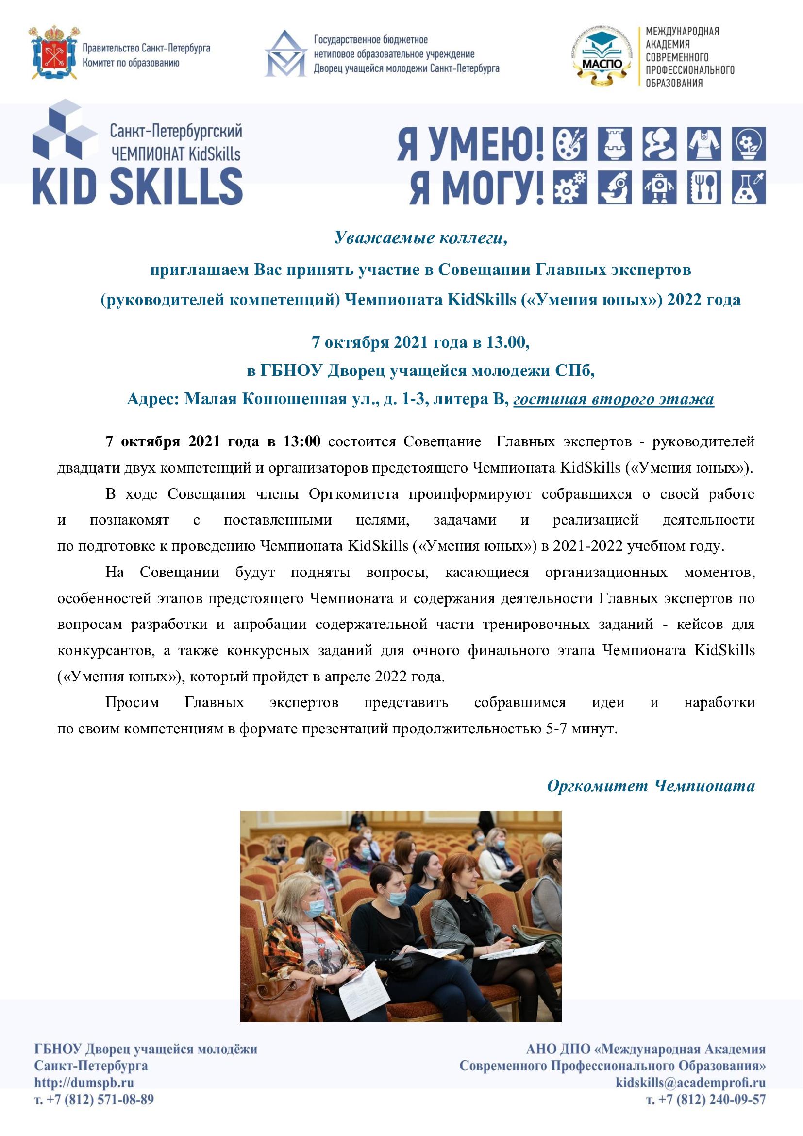 7 октября 2021 состоится совещание Главных экспертов с Оргкомитетом Чемпионата KidSkills