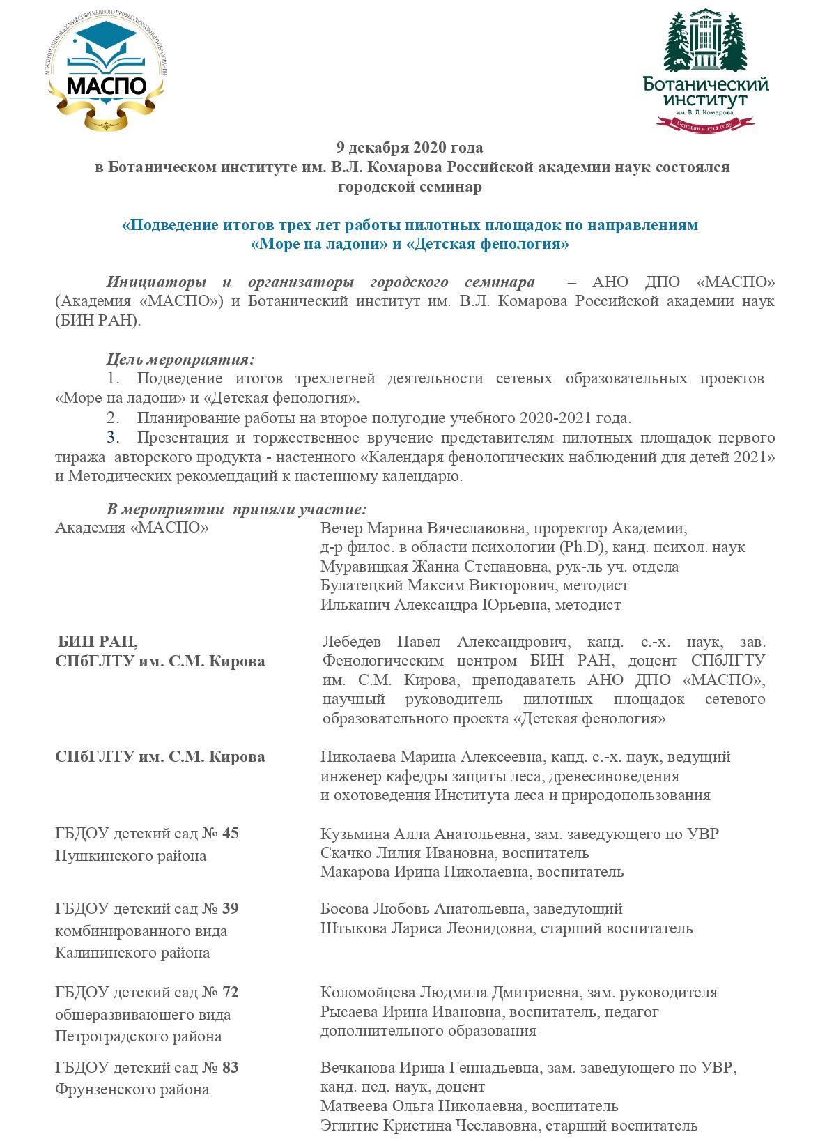 9 декабря 2020 года в Ботаническом институте им. В.Л. Комарова Российской академии наук состоялся городской семинар