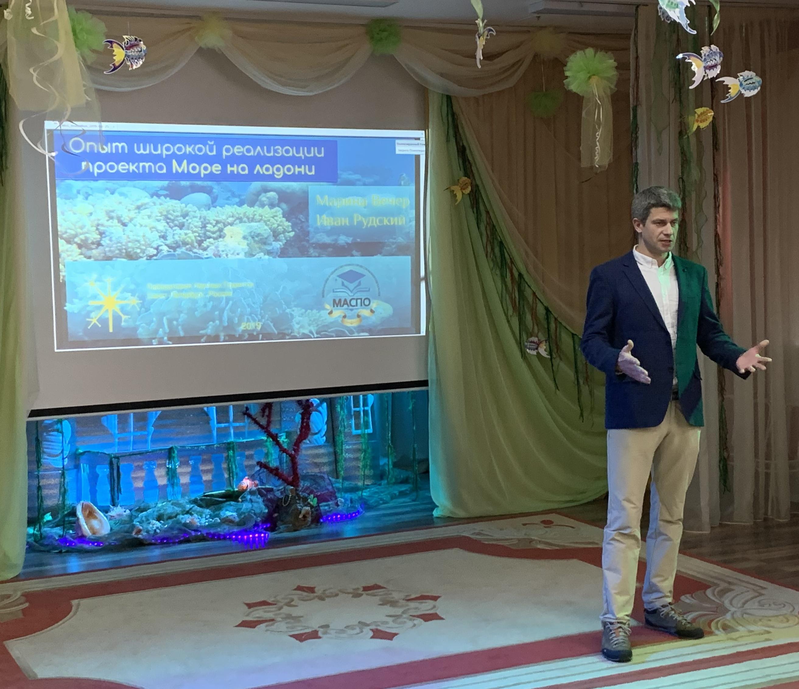 С подведением итогов по реализации детского федерального научного сетевого образовательного проекта «Море на ладони» выступил кандидат биологических наук, научный руководитель пилотных площадок АНО ДПО «МАСПО» Рудский Иван Вячеславович. Он рассказал о развитии проекта «Море на ладони» в 2018-2019 учебном году.