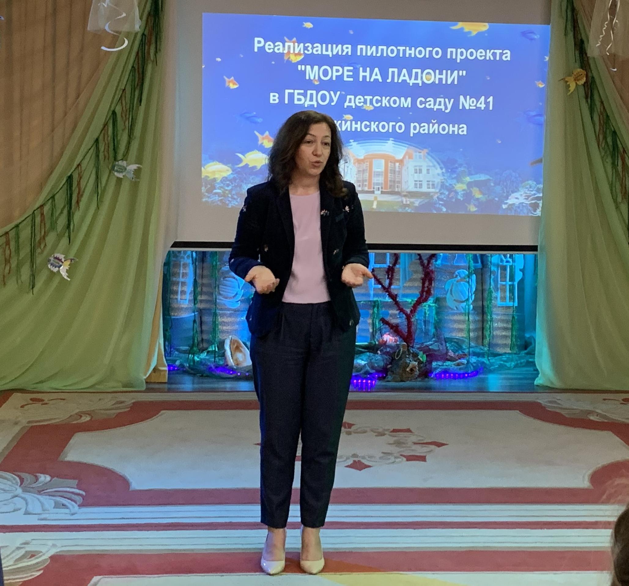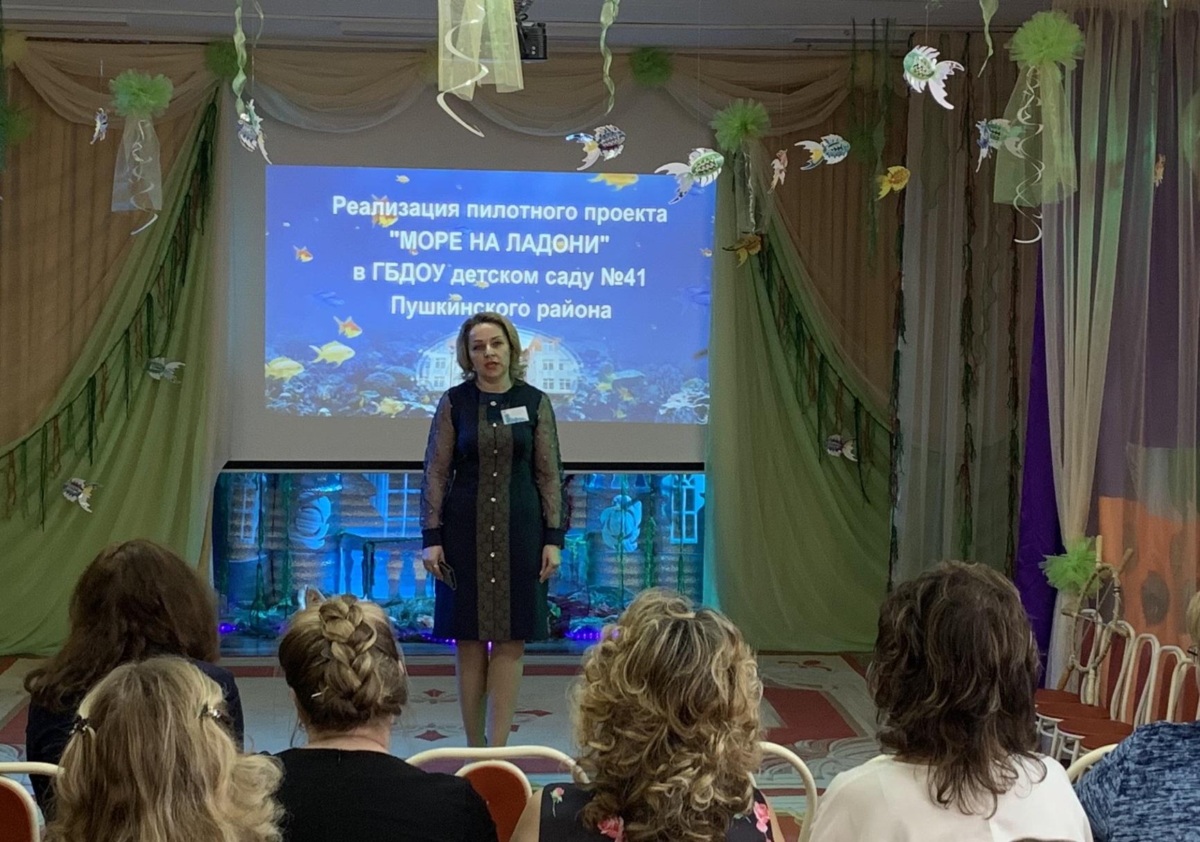 Теоретическая часть семинара –практикума была посвящена итогам исследовательской деятельности в рамках городского пилотного проекта «Море на ладони» в ГБДОУ детском саду № 41 Пушкинского района рассказал старший воспитатель Ивлева Наталья Владимировна.