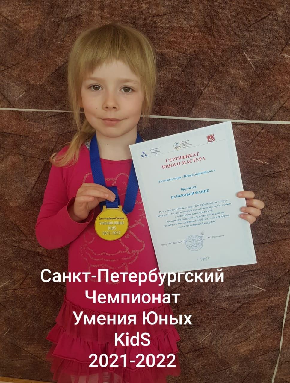 20.05.2022Поздравляем обучающуюся ГБДОУ детский сад № 142 общеразвивающего вида Невского района Санкт-Петербурга Панькову Фаину с заслуженной победой в Чемпионате "УМЕНИЯ ЮНЫХ" KidS 2021-2022