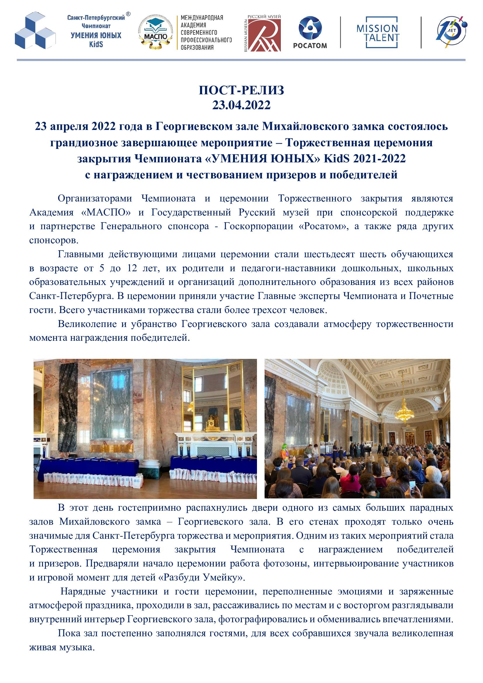 Пост-релиз Торжественной церемонии закрытия Чемпионата «УМЕНИЯ ЮНЫХ» KidS 2021-2022