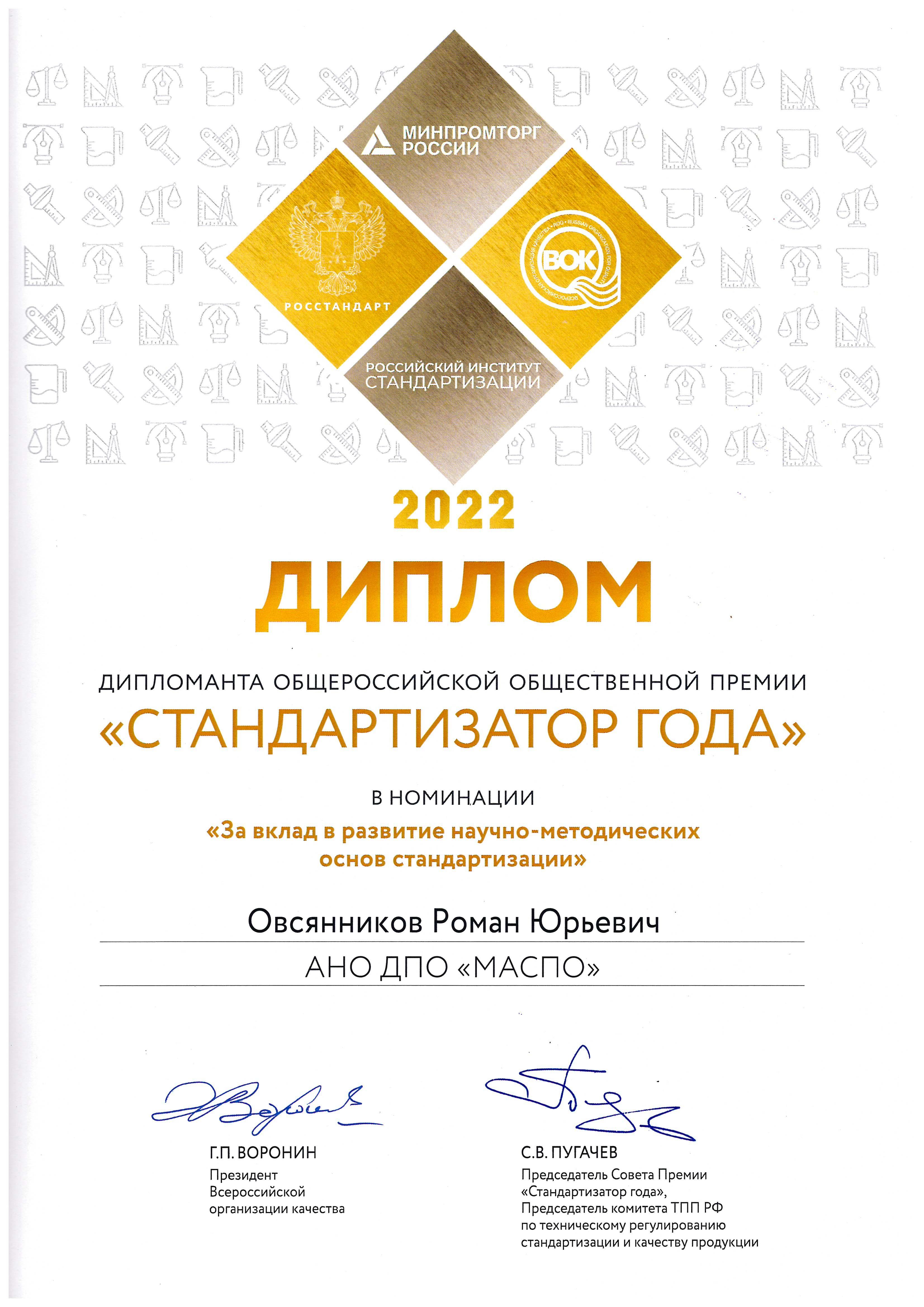 2022 Диплом Овсянников РЮ-Стандартизатор года2022