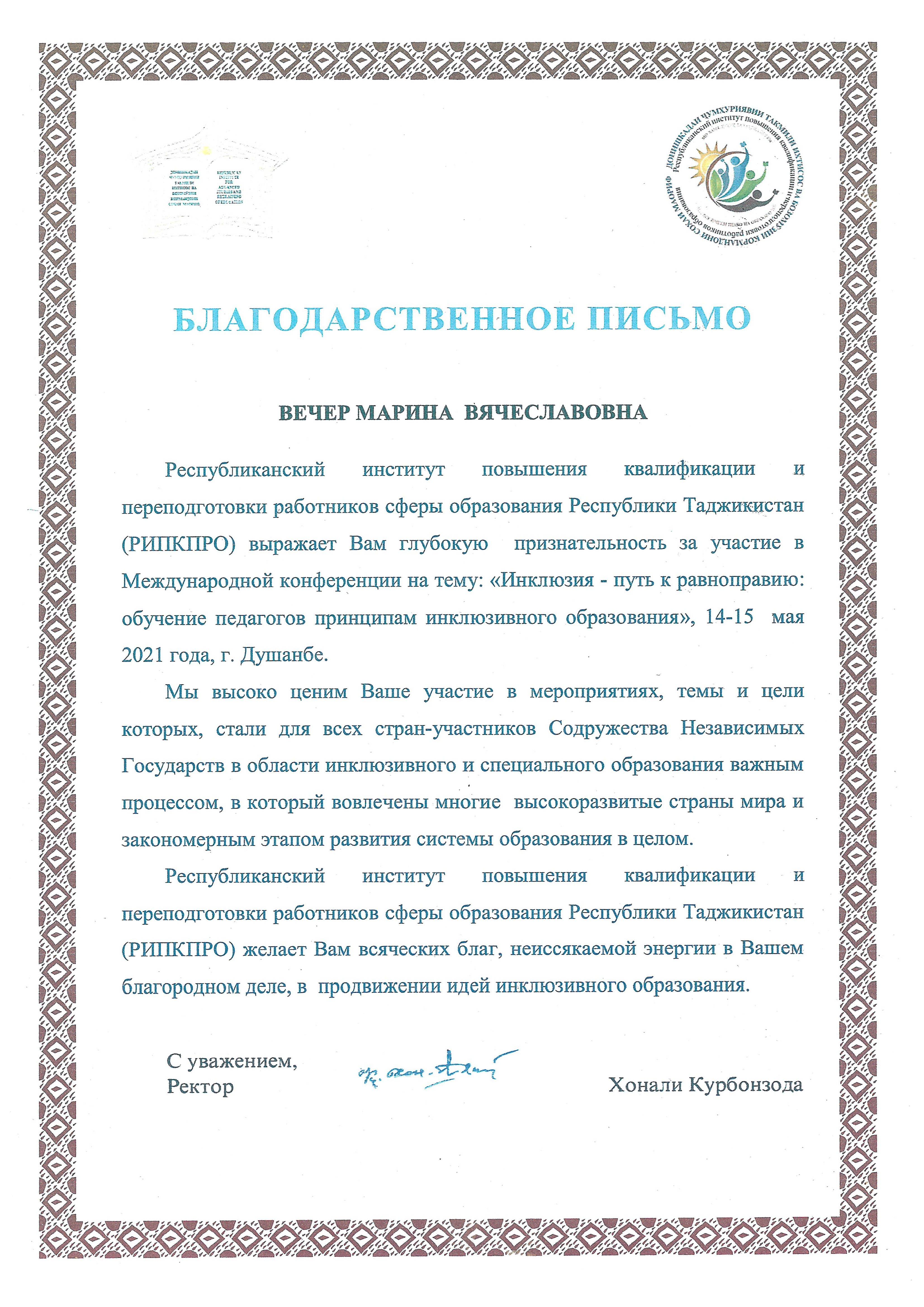 2021 Благ письмо от РИПКПРО-Респ Таджикистан